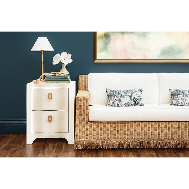 Description: CURVED FRONT SIDE TABLE WITH TWO DRAWERS IN WHITE TEXTURED LINEN WITH SATIN BRASS RING HARDWARE