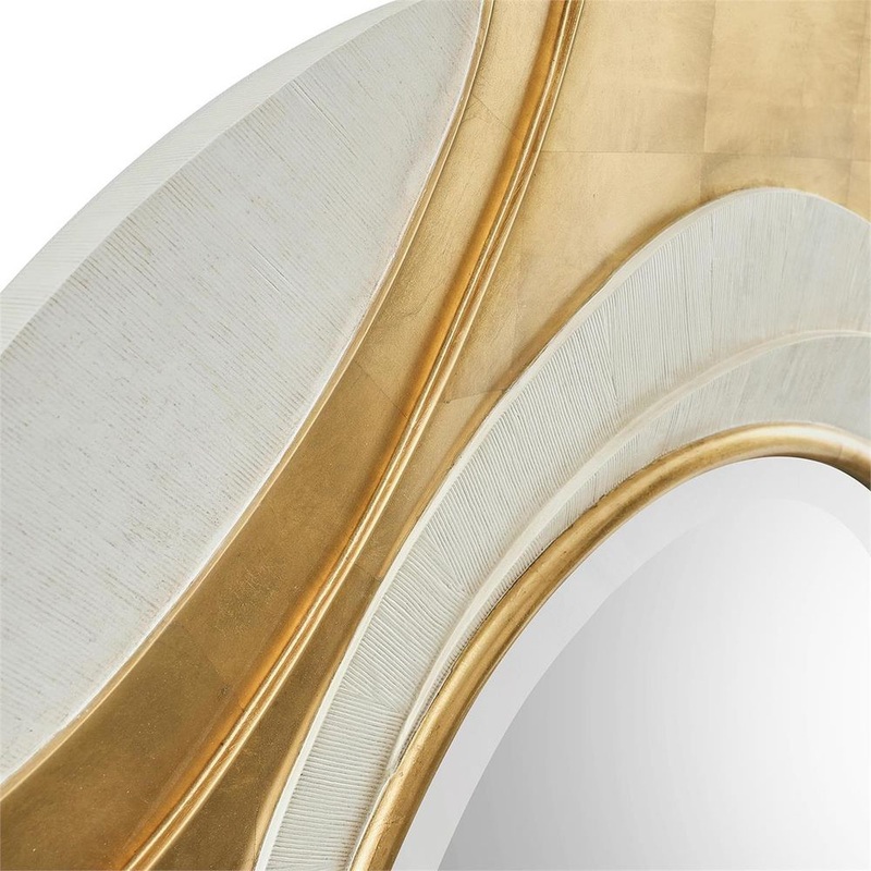 Helix Halo Mirror is a unique statement piece that greatly enhances a space with contemporary charm. The dimensional frame showcases a layered, twisting motif in a two-toned finish of Gold Coast and Gypsum. This innovative beveled mirror is affixed with French cleats and can rotate a full 360 degrees.