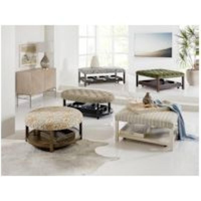 Introducing what we truly do best – great design, intricate, multi-step hand finishes and on-trend fabric offerings – to the occasional furniture category, the highly customizable Cocktails & More program offers a variety of options on eight upholstered cocktail tables, each of which include cocktail trays and casters. Available in round, square, oval or rectangle, the upholstered cocktail ottomans are available in a choice of more than 650 fabric options with tufted or non-tufted tops and a choice of eight finishes. An additional 15 Premier finishes – hand applied by our artisans – are also available, along with contrasting welt options and a choice of two sizes of nail-head detailing, available in four different finishes for further customization. Melding form with function, each style includes complementary solid wood serving trays for use in entertaining and hidden, locking casters for easy movement. The solid wood trays are crafted to nest on the cocktail ottomans’ bottom shelf for storage when not in use. Strategically placed wooden positioning pins on the bottom shelf help to lock the trays in place.