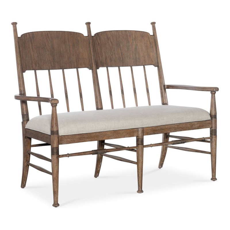 Description: Celebrating the natural beauty of a simpler time, the inviting Heritage Dining Bench has a nostalgic design including a spindle-style back with carved accents on the spindles and frame. The fabric seat is upholstered in the linen Biscuit performance fabric with welt trim. Crafted of Oak Veneers, the bench is finished in the gentle, warm brown Honey finish, with the look of pieces passed down through the family over time and revealing the rich oak character beneath.