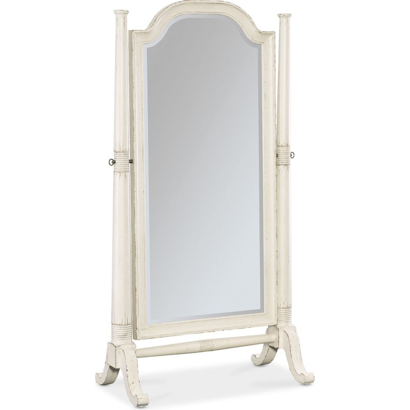 Description: Celebrating the winsome beauty of a simpler time, the Heritage Tilting Floor Mirror has beveled glass and carved accents on the posts and stretcher. The Daisy finish over Cathedral Oak Veneers suggests the natural wear one might expect of pieces passed down through the family over time, revealing the rich oak character beneath.