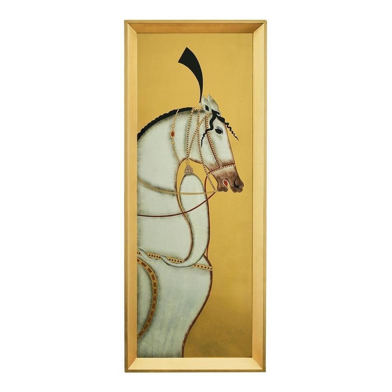The Heritage Horse Panel celebrates artistic creations from ancient times. The panel with glass displays a majestic white horse against an opulent background of gold leaf strips. The matching gold frame is affixed with D-ring hangers and may only be displayed from a vertical orientation.