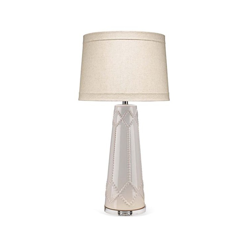 The Hobnail Table Lamp features subtle changes in color thanks to the studded detailing throughout its ceramic base. Its hand glazed finish has cream undertones that give this tall table lamp a more lightweight feel while still making a statement.