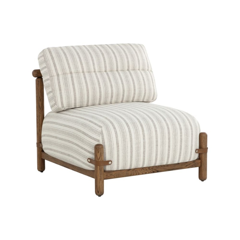 Description: With its relaxed form and classic striped print, the Holst Lounge Chair brings casual luxury to the forefront. A minimal frame made from brown oak wood supports plush cushions upholstered in gifford script fabric that is finished with leather strap detailing to complete the airy mid-century design.