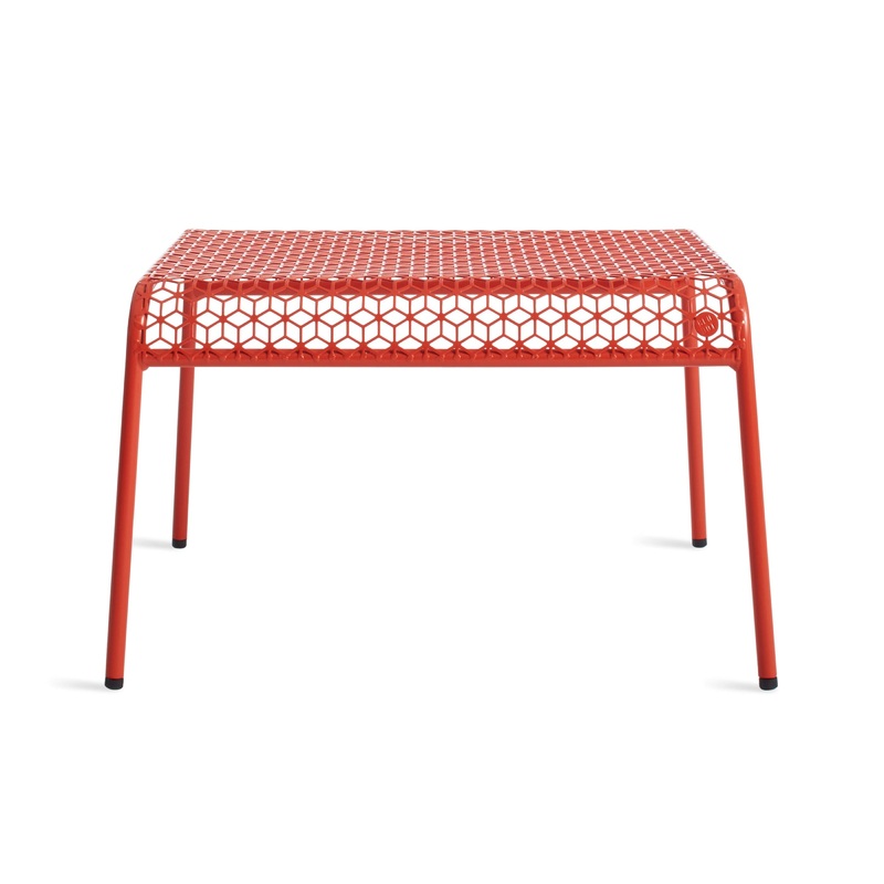 Inspired by handwoven rattan, we created a bold graphic pattern in punched metal while a simple, stackable tubular frame maintains the clarity of form. The result is friendly on the eyes as it is on weary legs. Pair with the Hot Mesh Lounge Chair or use it solo.