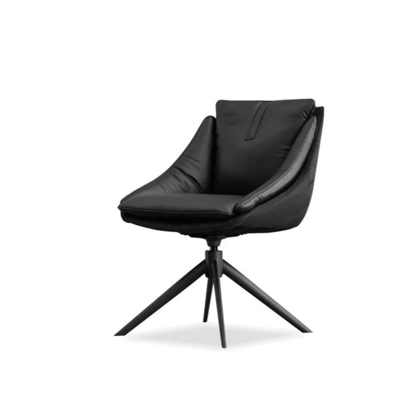 The Huracan dining chair features a stylish 360-degree swivel base made from bronze powder-coated steel. It is upholstered in a chic two-toned design, combining a Bruno Alcantara outer with a durable Bronzo Zante leather seat, ensuring both elegance and resilience.