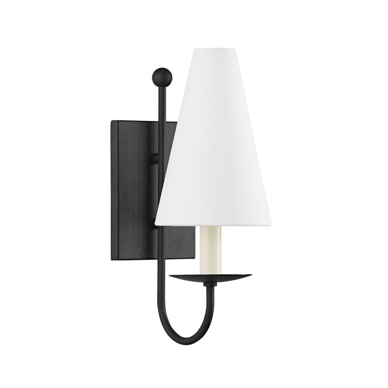 At first glance, Idris may look familiar with its white linen shade and traditional scone silhouette, but a closer look reveals surprising details. The swooping arm, large rectangular backplate, and ball finial give the fixture an updated feel.