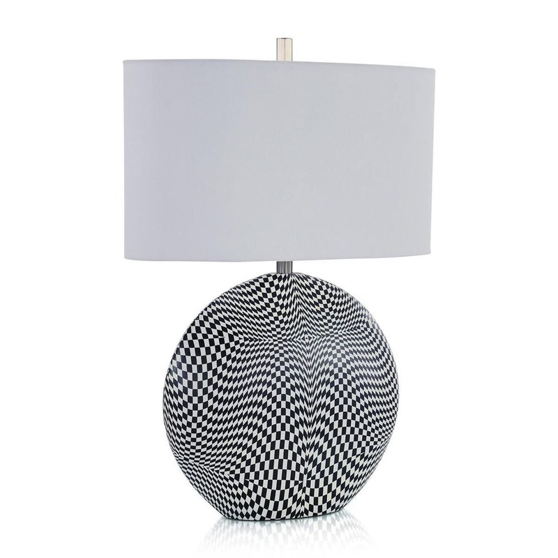 Illusive Grid Table Lamp is a stylish contemporary design with a mesmerizing look. This round table lamp showcases a distorted grid of black and white squares, creating a stunning visual effect. This chic modern design features metal hardware in a Nickel finish, matched by the cylinder finial. An oval lamp shade in a delicate white tone completes the look.