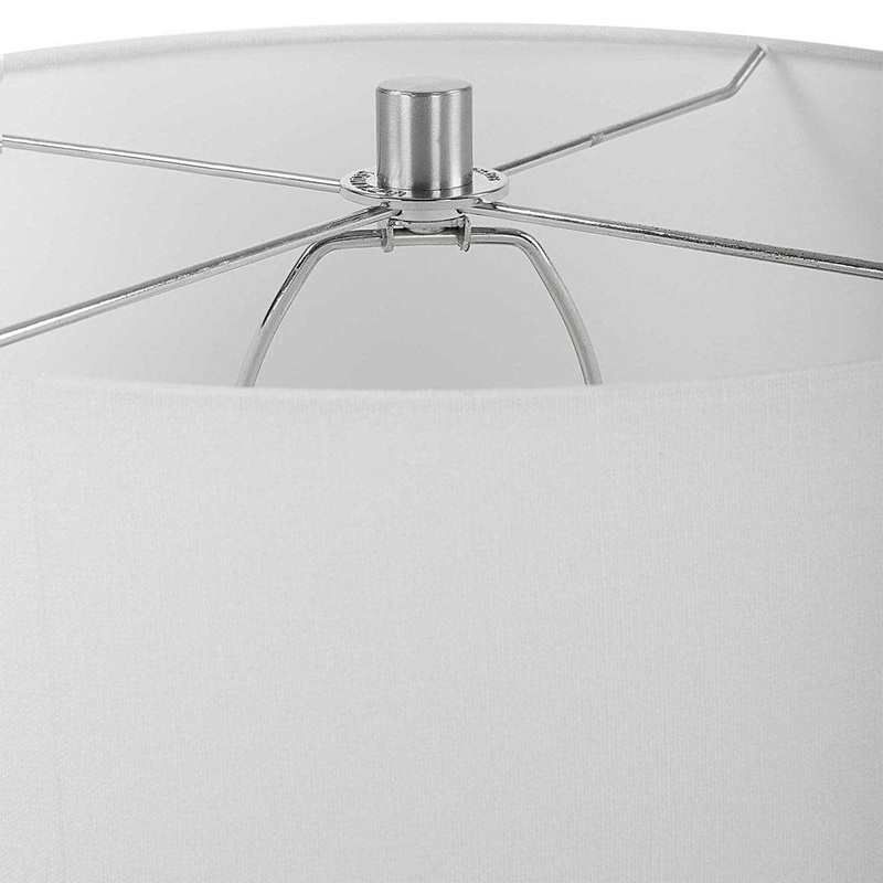 This sophisticated lamp displays a unique bubble glass base in tranquil aqua gray with plated brushed nickel accents and thick crystal details. Tapered hardback shade is covered in a crisp white linen fabric.