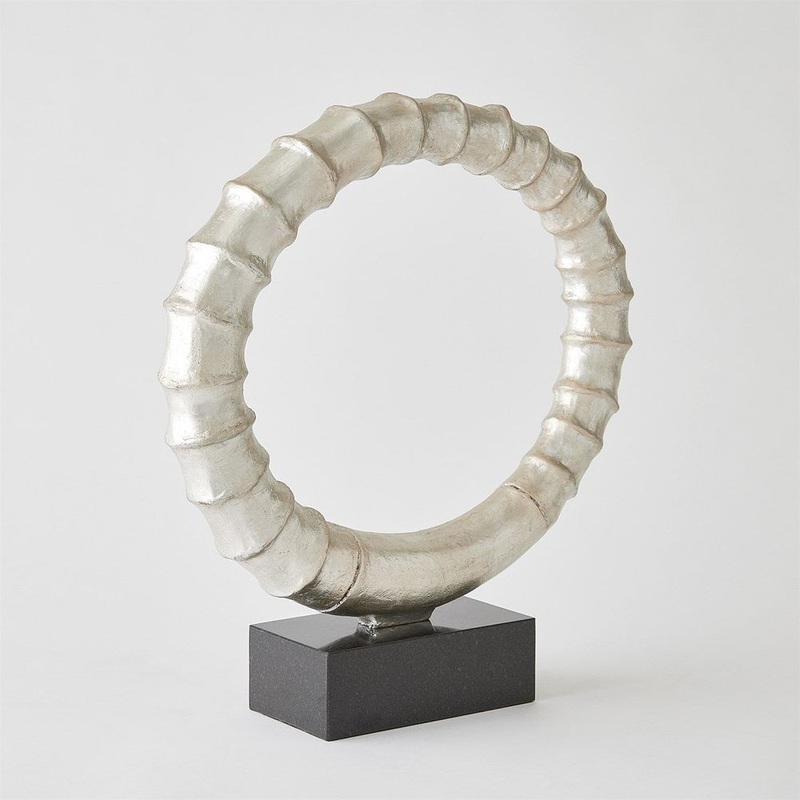 Description: The Infinity Horn Sculpture is crafted from cast iron with a hand-painted silver leaf finish and elegantly rests on a black marble base.