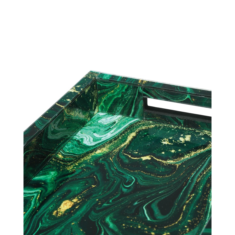 Description: Despite looking like it is made of stone, the Interstellar Green Tray’s surfaces are the result of green swirl paper being encased in glass. The coating brings the tray an unparalleled sheen. The interiors of the handles are covered in black felt and the bottom is covered in foam. Because this accessory is handmade, the patterns will vary.