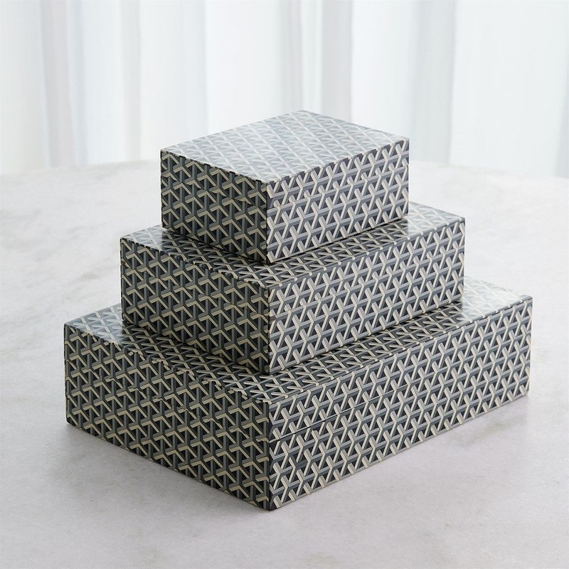Description: These beautifully crafted resin boxes feature an intricate pattern of interlaced shades of grey, creating a sophisticated and textured design that adds depth and elegance to any space.