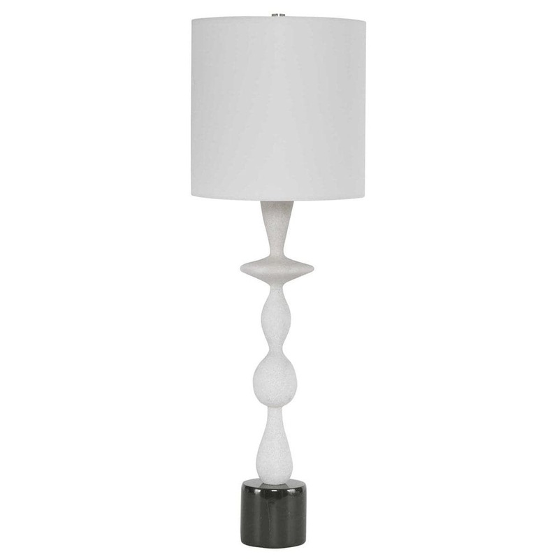 A modern black and white table lamp executed in a rich ivory man-made stone that accurately replicates the look of Thassos marble, displayed on a thick black marble foot. The lamp is complimented by a round hardback shade in white fabric.