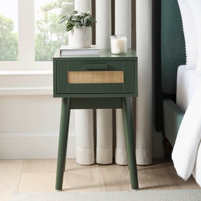 Featuring a rattan-detailed drawer and sleek retro design, this nightstand is available in a choice of stunning colours – black, cream, dark red, forest green, natural wood, or taupe. Perfect for keeping your bedtime essentials neatly tucked away while adding a touch of elegance to your room.