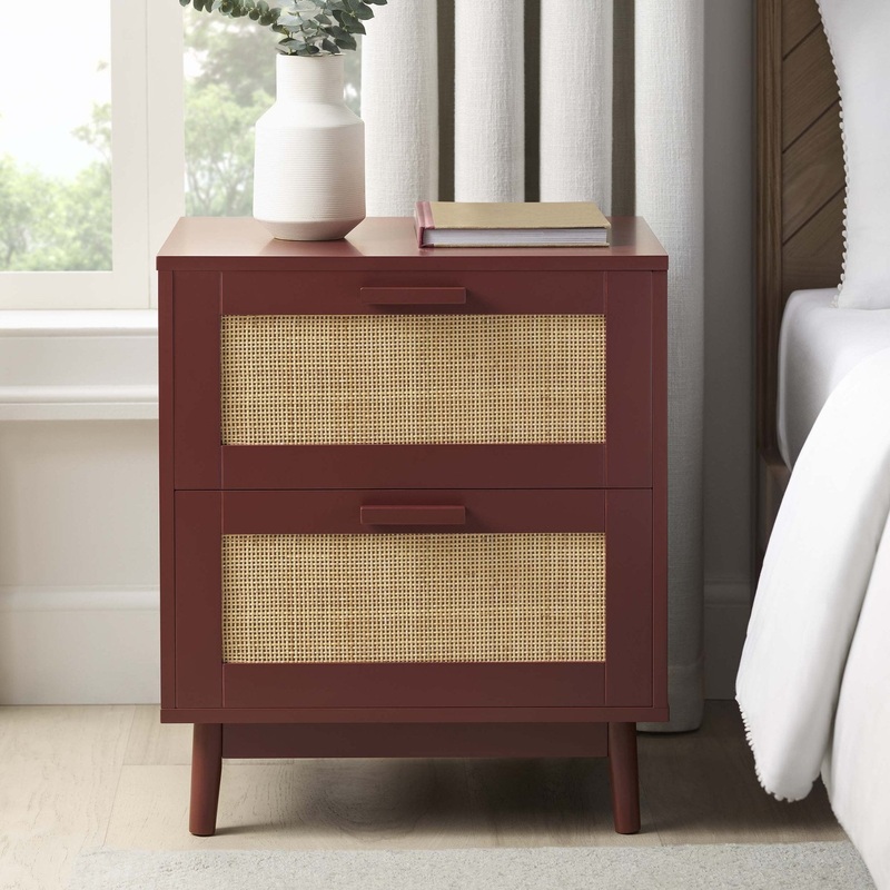 With its rattan detail and painted wood effect finish in red, the Isla 2 drawer bedside table will create a relaxed and stylish feel for your home. With 2 drawers with durable metal drawer runners, the Isla bedside table is contemporary yet elegant, and is the ideal place to keep your essentials to hand whether placed in the bedroom or used as a side table in your living room.