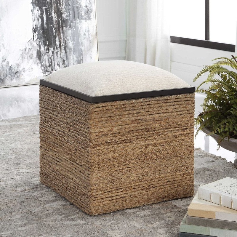 A unique blend of casual and coastal styles, this accent stool serves as a multifunctional storage piece with its removable lid. Can be used as extra seating or a pulled up as a footrest. The square base is wrapped in natural braided straw with matte black iron details and a plush upholstered seat in light beige performance fabric.