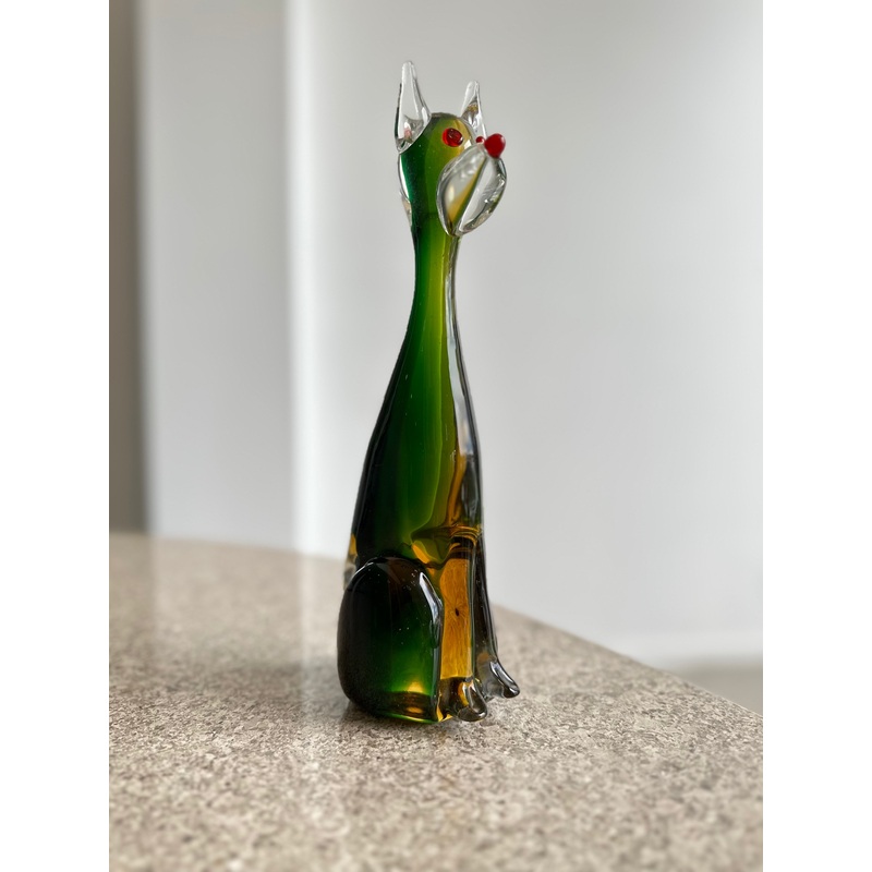 The figures elongated neck, pointed ears, and expressive face give it a whimsical yet refined presence. Its translucent glass body refracts light beautifully, enhancing its sculptural form and color depth. Each curve and detail reflects the artistry for which Murano glass is celebrated around the world.