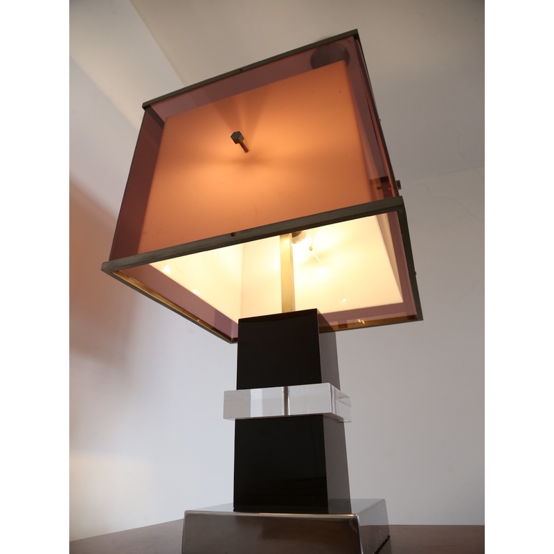 This striking table lamp by Romeo Rega embodies the refined modernist sensibility of 1970s Italian design. Featuring a bold architectural form, it is crafted from black Lucite columns mounted on a square brass base, and completed with double Lucite shades in two tones of purple, framed by sleek metal edges. The result is a sculptural lighting piece that combines geometric precision with a warm, atmospheric glow.