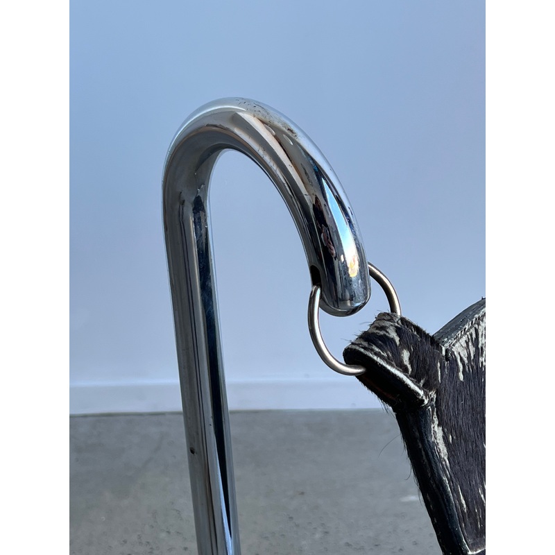 This early original edition (not the later 2007 reissue) highlights the designers ingenuity. The saddle-stitched leather seat is suspended within the steel frame, creating a perfect balance of tension and comfort while maintaining a dramatic sculptural presence. The interplay between industrial chrome and organic cowhide underscores the chairs daring modernity.