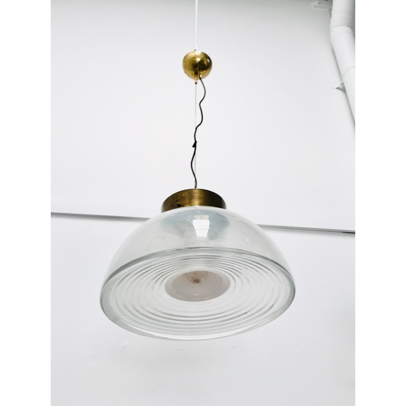 A striking Italian Murano glass and brass pendant from the 1960s, showcasing the refined craftsmanship of Venetian glassmaking. The thick glass dome shade diffuses light beautifully, while the brass mount adds a sophisticated mid-century character. Its clean form and subtle detailing make it an ideal choice for dining areas, kitchens, or modern interiors seeking an authentic design accent.