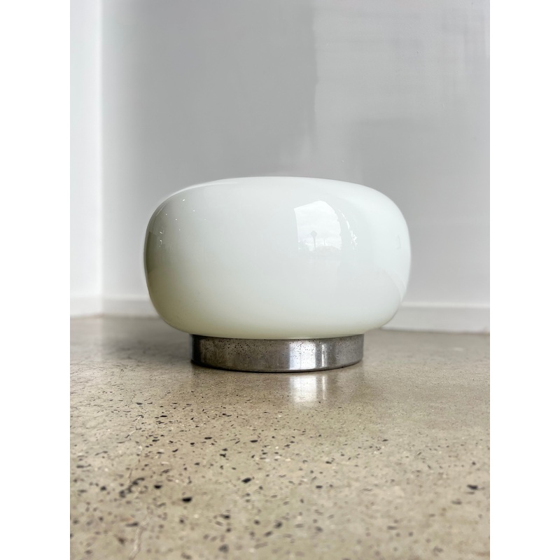 This Space Age Italian table lamp in opaline glass and chrome is a striking example of 1970s design. Its futuristic form and functional detailing reflect the eras fascination with modernity and innovation. The glossy opaline glass dome combined with a chrome lid creates a sculptural silhouette that doubles as both lighting and design statement.