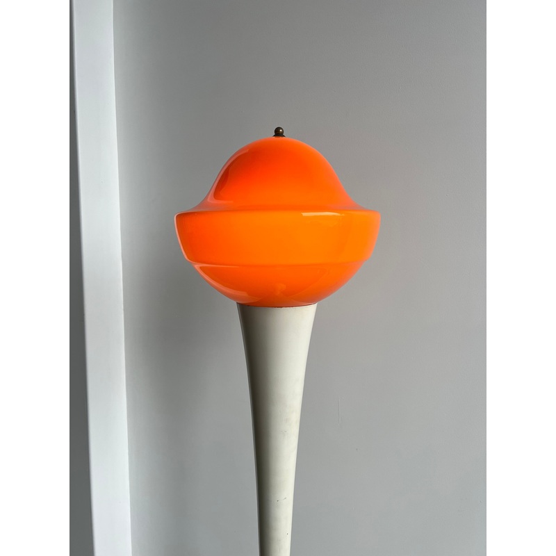 This Space Age floor lamp from Italy, dating to the 1970s, is a striking example of Murano glass design combined with mid-century modern materials. The lamp features a sculptural silhouette with a tall tapered white stem supporting an orange Murano glass shade, creating a bold, futuristic profile.