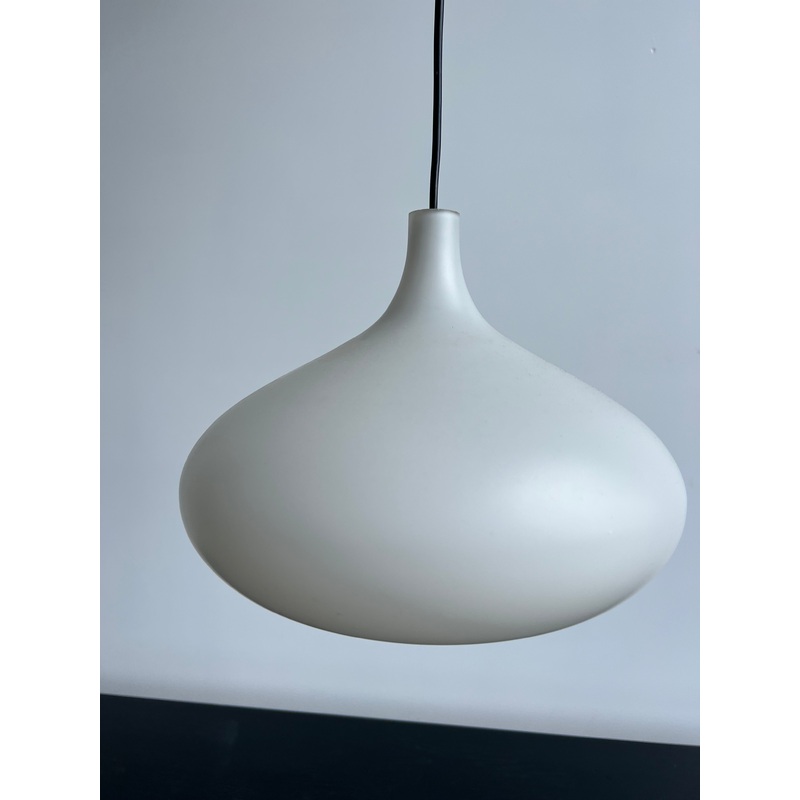 This Italian Space Age pendant light from the 1980s showcases the elegance and craftsmanship of Murano glass. The rounded white glass shade embodies a sleek, futuristic form typical of Space Age design, while providing a warm, diffused light perfect for contemporary or vintage-inspired interiors.