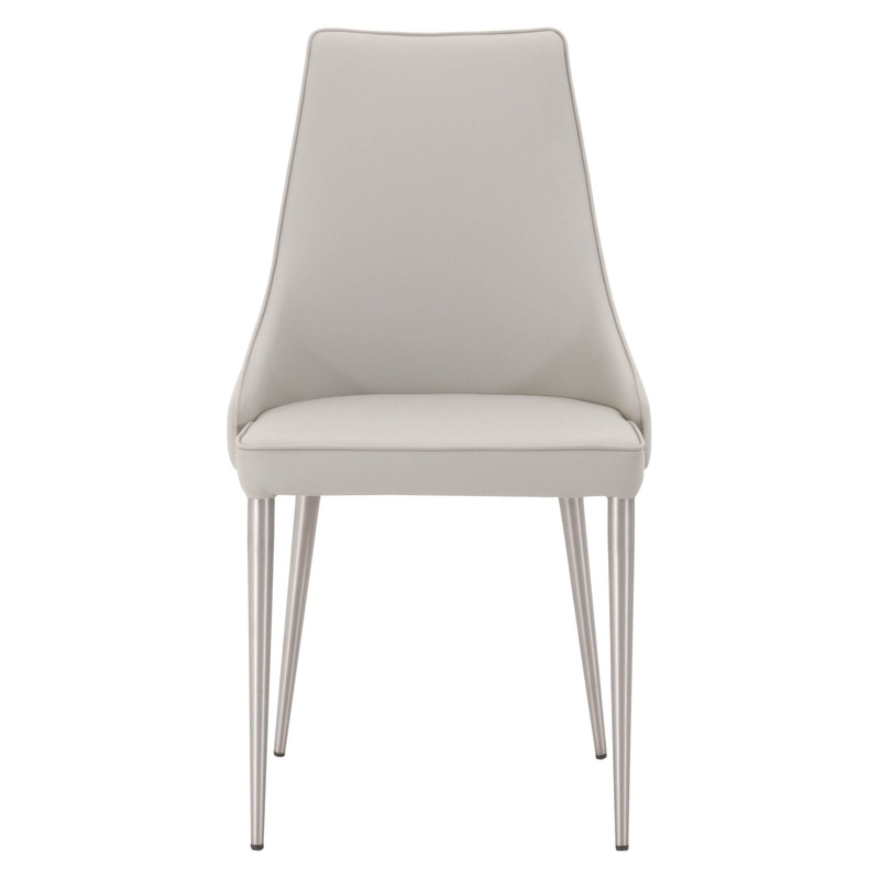 Transform your dining space with the Ivy Dining Chair by Essentials For Living. These contemporary chairs, constructed with stainless steel legs and light gray synthetic leather upholstery, seamlessly marry style and comfort. With dimensions of 18.5″ wide, 23.5″ deep, and 36″ high, including a seat height of 18″, these chairs offer not only a chic aesthetic but also exceptional comfort with their curved seat back. The stainless-steel legs feature a brushed finish and slim design, which contribute to their sleek look while ensuring stability. Elevate your dining experience with this fusion of modern design and luxurious comfort, as these dining chairs will perfectly complement your lifestyle with their cool tones and simplistic design.