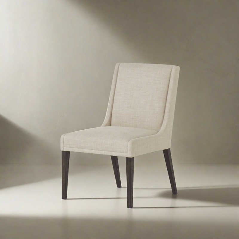 A simple, modern dining chair, suited for both traditionaland contemporary interiors. Crafted from a hardwoodframe, with solid oak legs in a striking dark espresso coloredstain, which supports a fully upholstered seat and back in aversatile textured linen fabric.