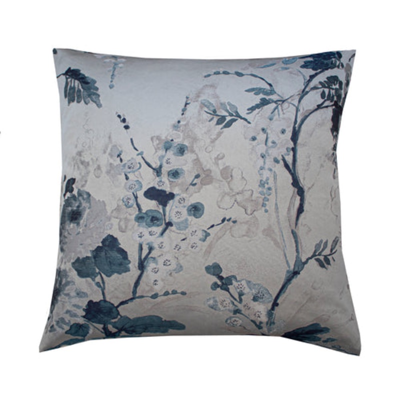 A traditional pattern in a fashion-forward color combination.The azure flower pops against the silver ground.