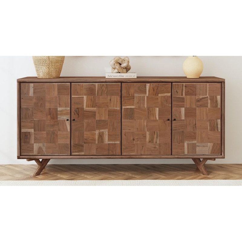 The Jarvis Server blends modern style with solid mango wood in a natural finish. With four doors showcasing a subtle patchwork pattern and matte black knobs, it offers both style and functionality. Inside, adjustable shelves with media cord management cater to your needs. Finished in natural mango with matte black accents, it boasts durability and elegance. Crafted from solid mango wood, each piece embraces natural wood grain variations.