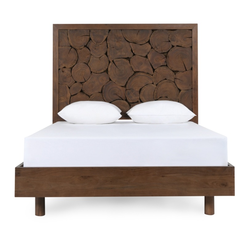 Introducing the Jaxon Wood Bed Cocoa Brown. Made from sustainable acacia wood, its medium to coarse grain and rich brown finish are expertly highlighted by hand, emphasizing the natural beauty of the tree. The unique headboard design adds a touch of elegance to any bedroom. Elevate your space with this exclusive piece.