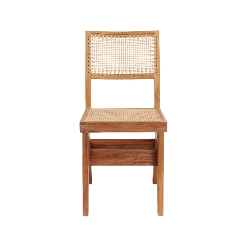 Our Jeanneret Side Chair is now perfect for outdoor use! Inspired bySwiss architect Pierre Jeanneret’s mid-century modern 1950sChandigarhdesign: Like the original, our contemporary reproductionhasV-shaped solid wood legs, and acane seat that provides plenty of comfort.