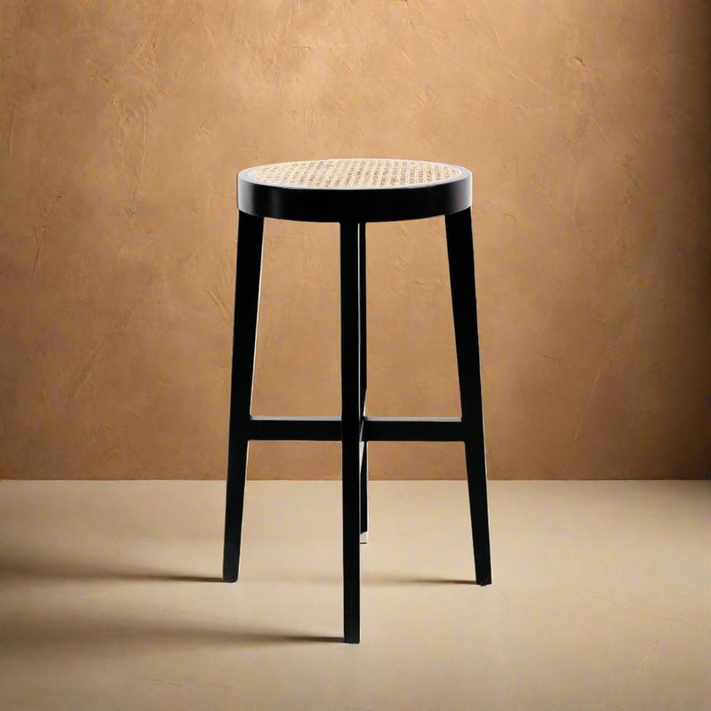 Jeanneret Round Bar Stool with Cane Seat – Rental Price/Week Black