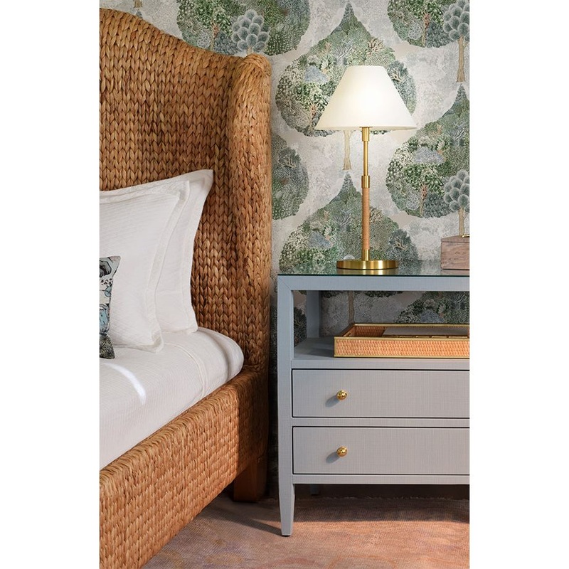 Description: WINGED HEADBOARD AND FOOTBOARD WITH SIDE RAILS IN NATURAL WATER HYACINTH, KING SIZE*Wood & Water Hyacinth have natural variations and may differ slightly between pieces.