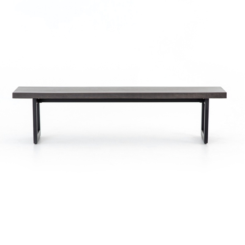 A spacious, black-finished iron base supports rectangular seating of black lava stone, for a long, clean look with industrial appeal. Cover or store indoors during inclement weather and when not in use.