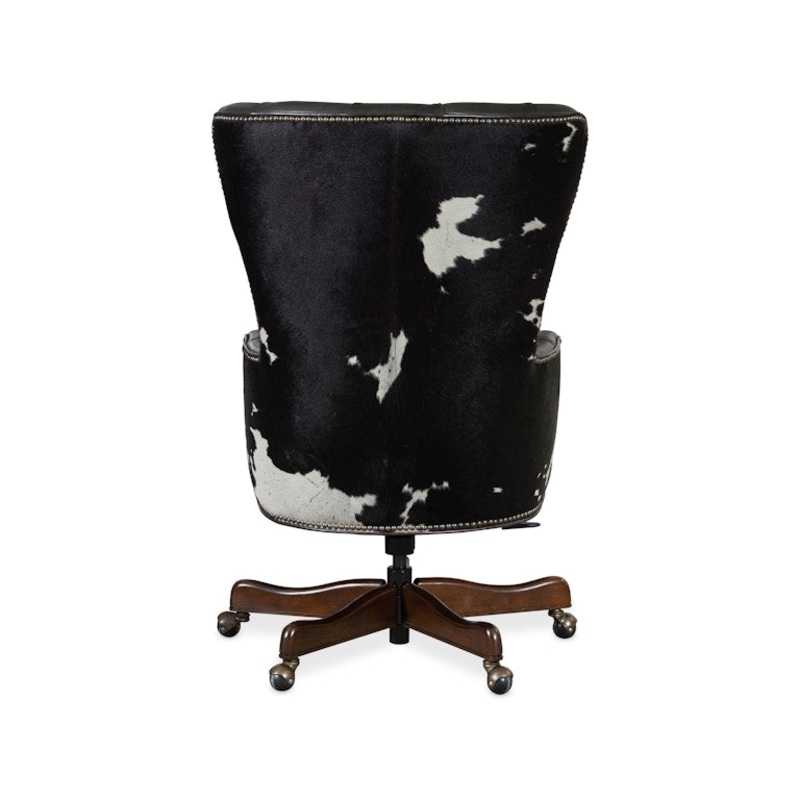 The classic wing executive chair gets reimagined with the Katherine Executive Swivel Tilt Chair. The inside seat and back is upholstered in the luxurious Legendary Graphite aniline leather, and the back and interior sides feature plush button tufting. The outside back is upholstered in black and white hair on hide. The wood base is finished in the dark Natchez Brown. On casters. Hooker Furniture Upholstery is a designer-inspired collection of upscale leather seating that includes versatile reclining chairs, modern-day reclining sofas, eclectic club and artisan accent chairs, as well as a selection of executive desk chairs for the home. Designed and curated to appeal to a variety of style tastes, each piece from Hooker Furniture Upholstery is meticulously crafted in a unique selection of textures and hues.