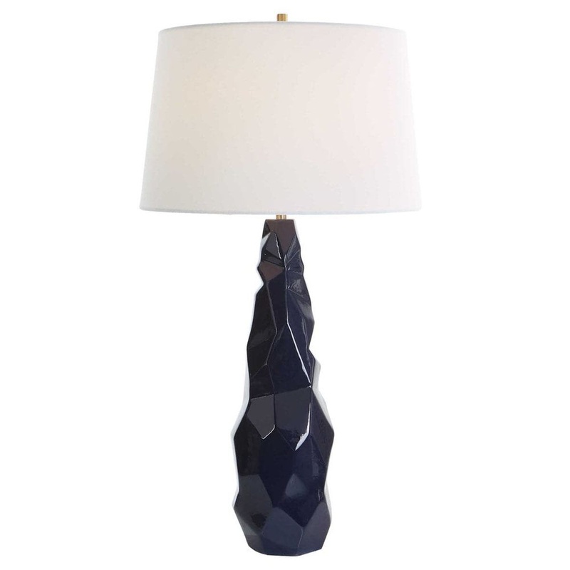 This ceramic table lamp showcases a contemporary abstract geometric design finished in a striking navy blue gloss glaze with plated brushed brass details. Paired with a tapered hardback shade in a white linen fabric.