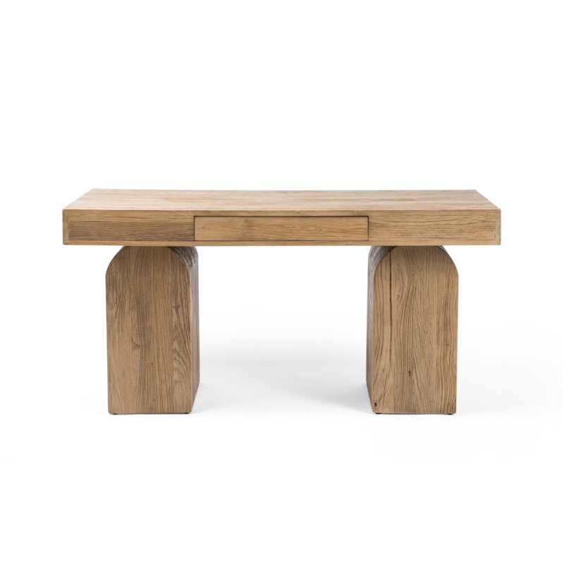 A study in shape. Handcrafted from solid reclaimed elm with visible knots and graining, chunky arched legs support a rectangular desktop with a spacious single drawer. Finished back grants the option to float desk anywhere in room.