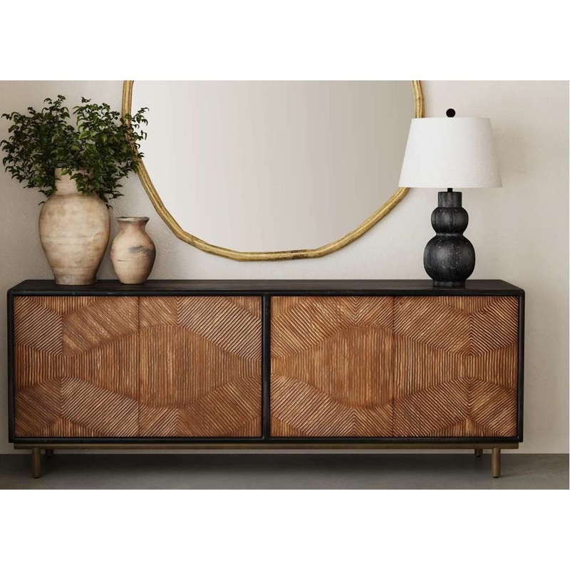 Introducing the Keir Server seamlessly blends modern aesthetics with a warm, moody color palette. Crafted from solid mango wood, its two-tone dark brown and ebonized finishes create captivating visual contrast. The dramatic iron base, finished in brushed brass, adds sophistication. Opening the doors reveals an organic-inspired geometric design, complemented by push-clasp hardware. Inside, discover functionality at its best with four adjustable shelves and thoughtful media cord management.