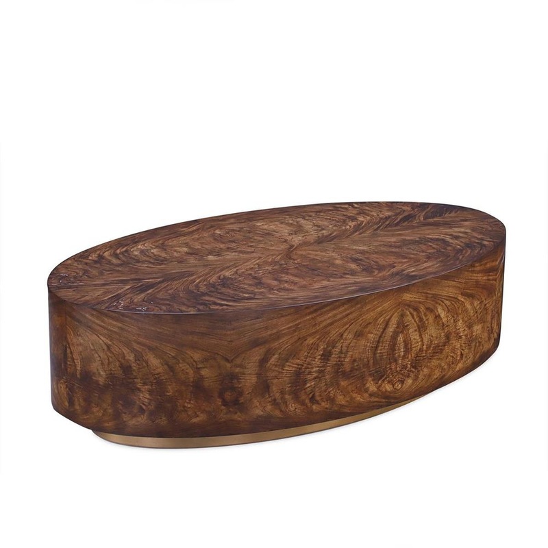 The Kestrel Cocktail Table showcases a sleek, contemporary design with beautiful natural tones. Crafted from zebralli wood, the ovate table is adorned in a Lucerne finish that gracefully highlights the organic grain patterns. A refined plinth base in radiant Antique Gold tones enhances the design with a modern touch.