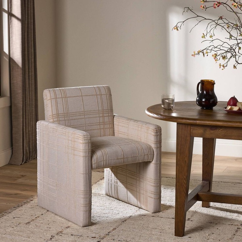 Think outside the box for everyday dining. Sandy-colored performance fabric covers a soft, voluminous shape with oversized proportions.