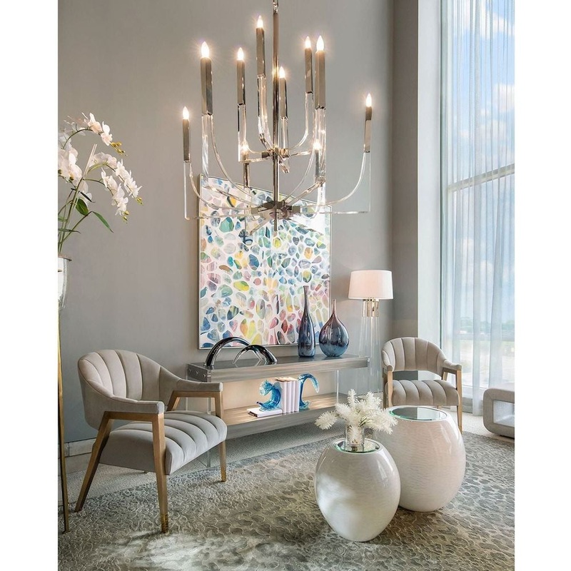 Classic form meets graphic modern design in this acrylic and polished nickel, ten-light chandelier with two tiers.