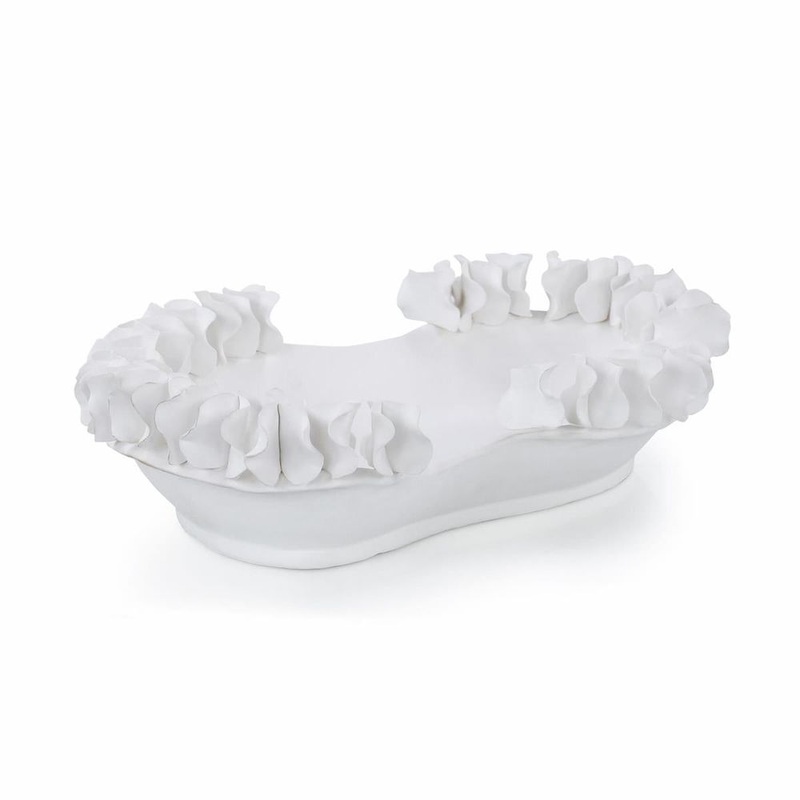 The Lace Bowl is a gorgeous home accent, crafted from porcelain, showcasing an abstract shape lined with dimensional ruffles. Masterful craftsmanship has formed the porcelain to appear as soft and delicate as real fabric.
