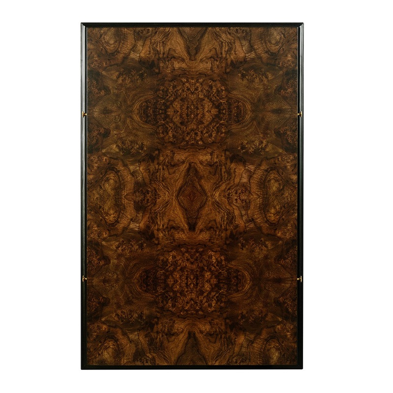 Description: Our Lafayette Coffee Table features a smooth top and shape, four storage drawers, shelving, and tapered legs; Natural finish on Walnut burl veneer; Espresso finish on Acacia crown veneer and solids.