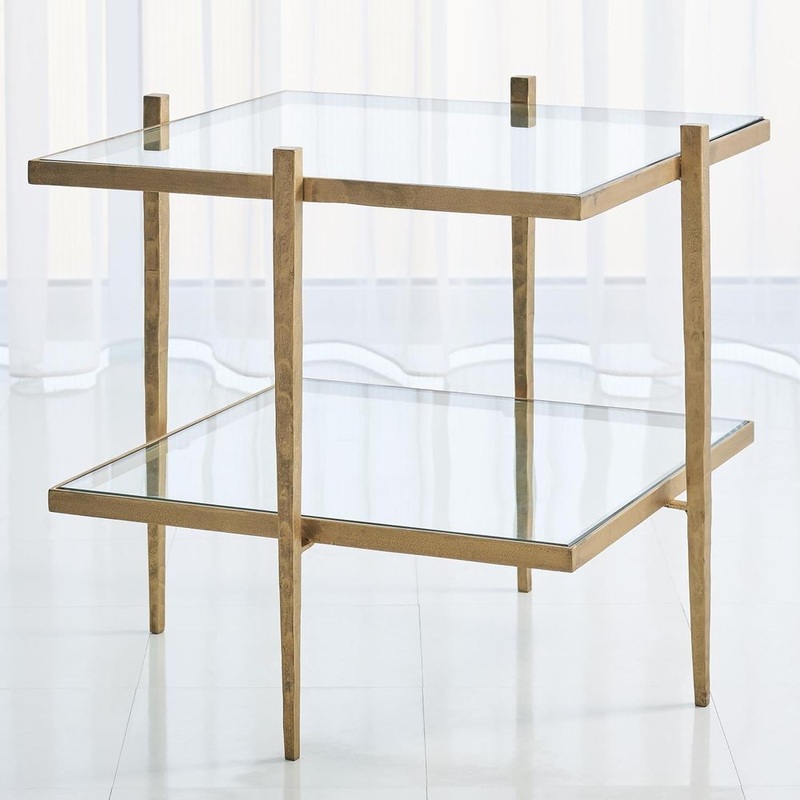 Description: The Laforge End Table features an iron frame with an antique gold finish and a clear, tempered glass table top and lower shelf. For added design interest, the tapered legs are uniquely positioned at the middle of each side of the table as opposed to the corners, which is the typical placement. How beautiful! Also available in a natural iron finish.