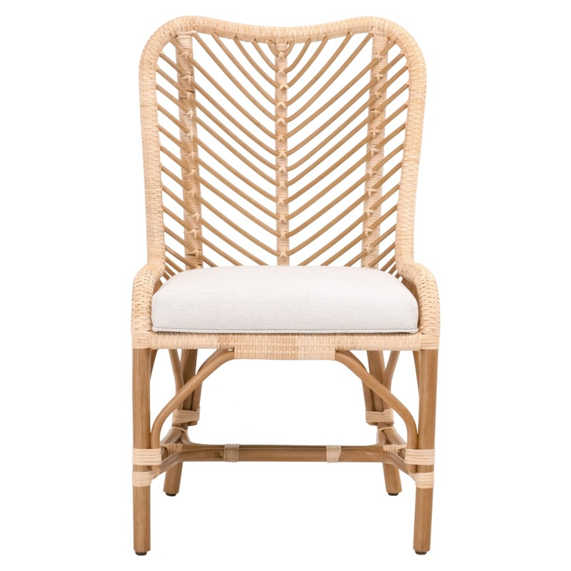 These tropical-inspired rattan dining chairs feature a neutral color palette with brown and white tones. Constructed with natural rattan, sanded rattan peel binding and white speckle olefin fabric, these chairs look very natural and sit well in many settings including tropical, coastal, transitional and bohemian. The backs are designed with a unique chevron pattern that adds dimension and appeal to these chairs. The three-way leg stretchers are wrapped with lighter rattan, which nicely ties in with the white seat fabric and lighter rattan binding on the seat frame. Though these are made for indoor use, they are sure to add an element of outdoor style to your kitchen or dining room.