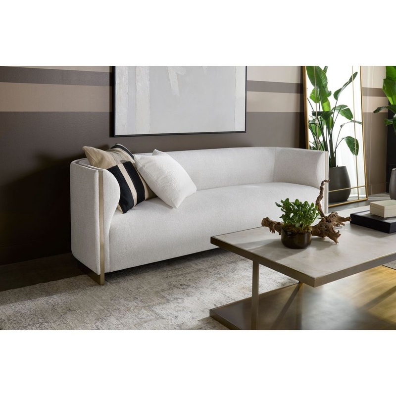 Description: The Larron Sofa balances mixed materials to bring this contemporary design to life. Expertly upholstered in rhea light barley performance fabric for a soft touch. Gold stainless steel metal inlay and padded curves accentuate the chair’s curved silhouette. Performance fabric is moisture repellent, durable and easy to clean.