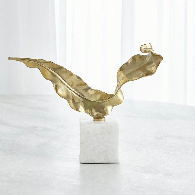 Description: Nature meets art in our stunning Leaf Sculptures. Made from iron with a polished brass finish, these marvelous sculptures sit atop a solid white marble base.