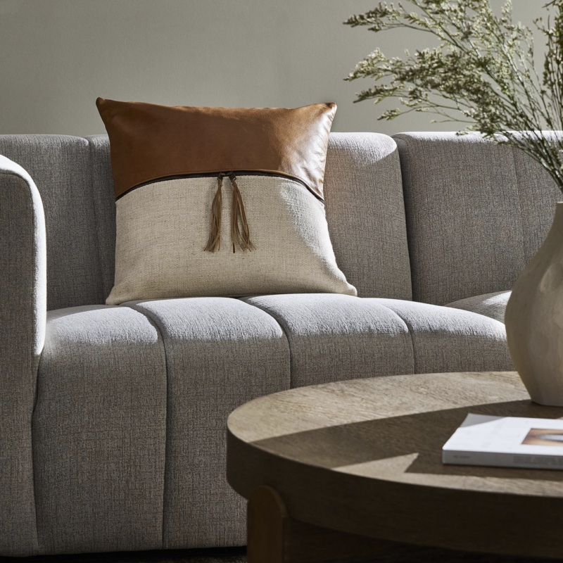 A linen throw pillow features a tan top-grain leather panel plus zipper detailing, for a material-driven twist on dcor. Performance fabrics are specially created to withstand spills, stains, high traffic and wear, ensuring long-term comfort and unmatched durability.